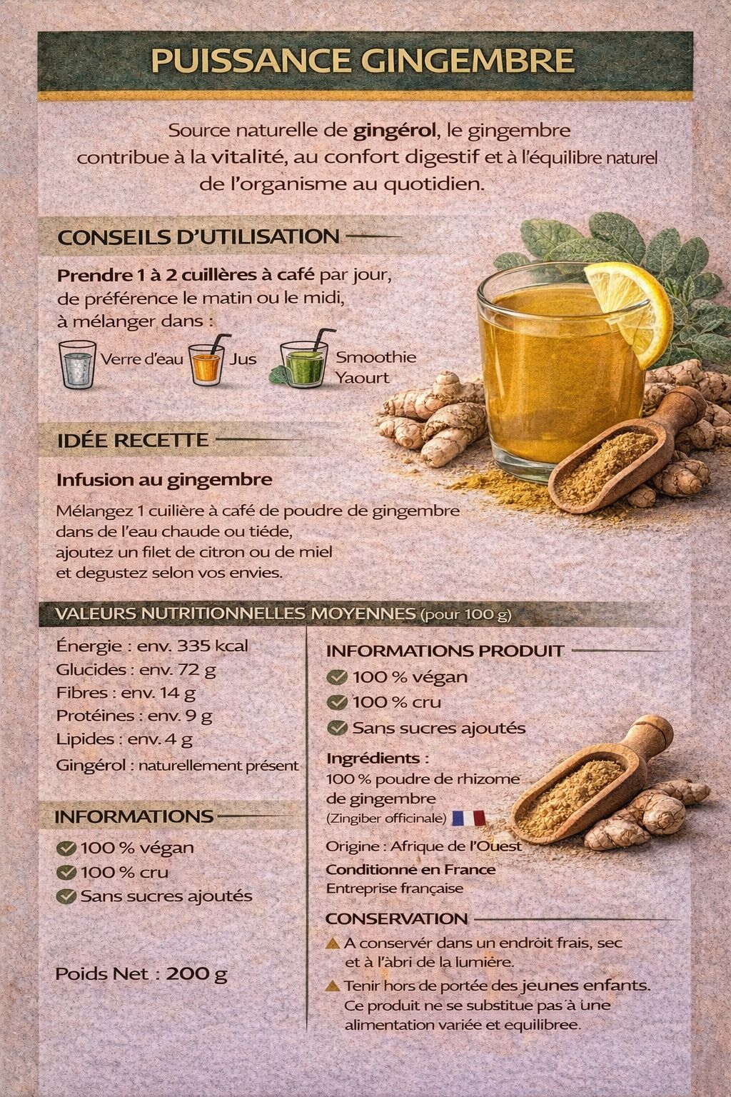 100 % poudre de gingembre biologique (Zingiber officinale), issue de rhizomes soigneusement sélectionnés et séchés à basse température.
